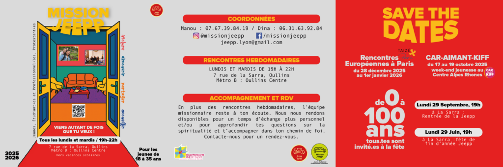 Pour l’année 2025-2026 les rencontres de la Mission Jeepp se dérouleront tous les lundis – hors vacances scolaires et jours fériés – à partir de 19h à la Sarra, en salle Jonas.