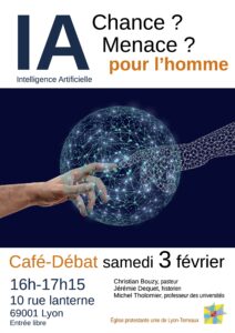 Café-débat : L'Intelligence artificielle, chance ou menace pour l'homme ? avec : Christian Bouzy, pasteur Jérémie Dequet, historien Michel Tholomier, professeur des universités Samedi 3 février, 16h à 17h15 Au Temple des Terreaux, 10 rue Lanterne Entrée libre.