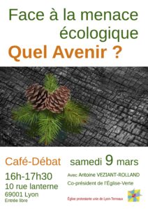 THÈME : Face à la menace écologique, Quel Avenir ? Avec Antoine VEZIANT-ROLLAND, Co-président de l'Église-Verte Samedi 9 mars 2024, 16-17h30, au Temple Lanterne. Entrée libre