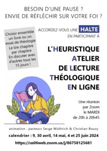 Chers ami-e-s, Voici une initiative de mon collègue Serge WUTHRICH à laquelle je m'associe volontiers. Prendre une pause de ¾ d'heure, un mardi tous les 15 jours pour partager la lecture d'un ouvrage théologique, en visio. Si vous êtes tentés, rejoignez-nous sur le lien https://us06web.zoom.us/j/86758125681 Dés le mardi 9 avril à 20h, car nous choisirons ensemble le livre dont nous discuterons. Bien fraternellement, Pasteur Christian Bouzy
