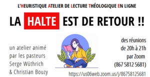 Chers ami-e-s, La HALTE est de retour! Voici une initiative de mon collègue Serge WUTHRICH à laquelle je m'associe volontiers. Prendre une pause d'une heure, un mardi tous les 15 jours ou 3 semaines pour partager la lecture d'un ouvrage théologique, en visio. Pour cette reprise on vous propose de lire ensemble Que faire du Notre Père? de Anne-Catherine Baudoin. -18 février: lecture des chapitres 1 et 2 -4 mars: lecture du chapitre 3 -25 mars: lecture du chapitre 5 -15 avril: lecture du chapitre 6 Si vous êtes tentés, rejoignez-nous sur le lien https://us06web.zoom.us/j/86758125681 dès le mardi 18 février 2025 à 20h. Bien fraternellement, Pasteur Christian Bouzy