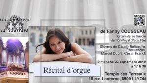 Bienvenue au traditionnel récital d’orgue des journées du patrimoine ! Cette année, nous aurons de plaisir d’entendre Fanny Cousseau, organiste au Temple de Port-Royal (Paris 13e), lauréate en 2019 du Prix de la meilleure interprétation des œuvres de Messiaen ainsi que du 4e Prix du Concours international Olivier Messiaen. Elle est actuellement élève de François Espinasse et Liesbeth Schlumberger dans la classe d’orgue du CNSMD de Lyon. Elle interprètera des œuvres de Claude Balbastre, César Franck, Éric Lebrun, Marcel Dupré, Olivier Mesiaen, Louis Vierne, Jacques Boyvin, Maurice Ravel. Retransmission sur grand écran. Entrée libre, libre participation aux frais.