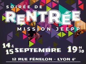 Information Rentrée Mission Jeepp Bonjour les amis, Comme vous probablement le savez, la situation sanitaire est encore compliqué à Lyon. Mais, de toute façon, nous voulons vivre l'expérience de notre fête de rentrée, ce moment si important pour nous. Alors, nous vous proposons la soirée de rentrée en 2 moments : nous gardons le lundi 14 et nous lançons une deuxième "séance" le mardi 15 septembre, les deux à 19h30 (12 rue Fénelon). Sous Inscription ! Les places sont limitées à 35 personnes par soirée. Alors, inscrivez vous avec Mariana Erhardt (07 68 46 86 73) ou Mateus Pereira (07 68 01 38 86) par téléphone ou par e-mail (missionjeepp@nullgmail.com). Le nombre d'inscriptions suit dans les commentaires. Bon, nous comptons sur votre compréhension et surtout sur votre participation. Bonne semaine à tous ! Plus d'infos sur Facebook : https://www.facebook.com/missionjeepp