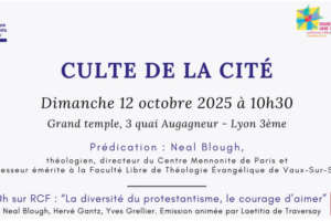Exceptionnellement il n’y aura pas de culte au temple des Terreaux rue Lanterne, car nous sommes toutes et tous invités au culte commun célébré avec les autres paroisses et églises de la Fédération Protestante de France, au Grand Temple, 3 quai Augagneur, Lyon 3ème. La prédication sera apportée par Neal Blough. Pour plus d'informations : https://region-car.epudf.org/evenements/culte-de-la-cite-lyon/