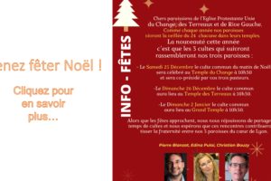 Culte dominical, rue Lanterne. Bienvenue ! CULTE COMMUN AVEC LES PAROISSES DE LYON Covid : Strict respect des mesures sanitaires. Masque obligatoire. Le Culte a lieu tous les dimanches à 10h30, au Temple de la rue Lanterne (avec mise en place d’un service de garderie : c’est l’occasion d’accueillir la jeunesse de notre Église). À Caluire et Cuire, au centre paroissial, un Culte est également organisé les 1er et 3ème lundi de chaque mois à 12h15 ; il est suivi d’un repas partagé. Pour plus d’informations : http://www.templelanterne.fr/le-culte/